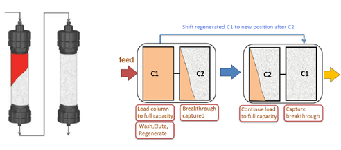 ??? ?? 傳統(tǒng)層析工藝,由于流穿效應(yīng),有30-50%的填料是無法被完全利用的,從而使得載量和處理量大為受限。Capture SMB用于優(yōu)化捕獲環(huán)節(jié),作為最簡單和最優(yōu)化的2柱位設(shè)計(jì),可使純化效率顯著提高,并且使填料用量大為縮減。
