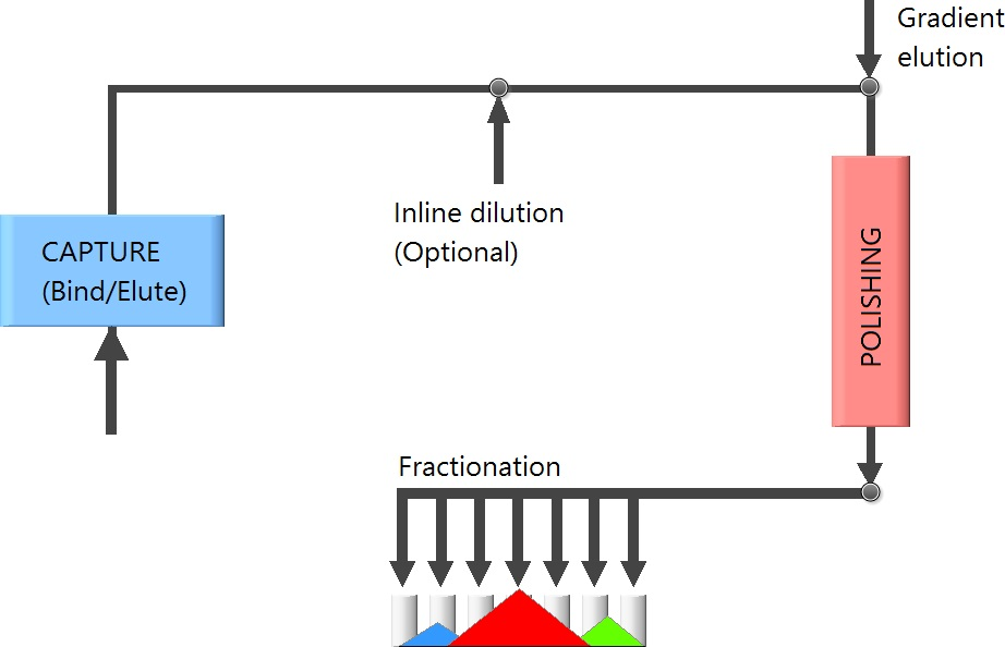 所有的Contichrom系統(tǒng)可以將兩個層析步驟(例如捕獲和精純)整合為一個單一的過程,第一步層析洗脫的產(chǎn)物可以直接被稀釋,從而直接進行第二步層析,因此省略了中間的間歇過程,這是非常適用于高生產(chǎn)量純化的。