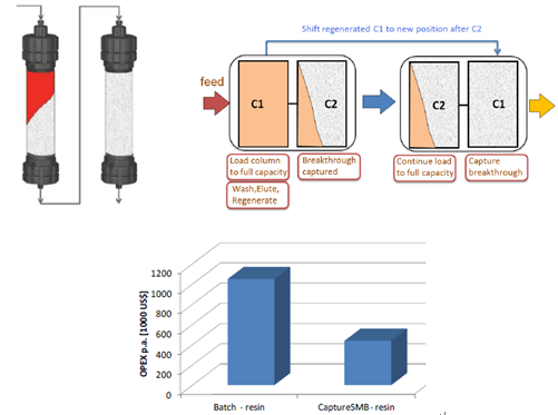 傳統(tǒng)層析工藝,由于流穿效應,有30-50%的填料是無法被完全利用的,從而使得載量和處理量大為受限。Capture SMB用于優(yōu)化捕獲環(huán)節(jié),作為最簡單和最強大的2柱位設(shè)計,可使純化效率顯著提高,并且使填料用量大為縮減。