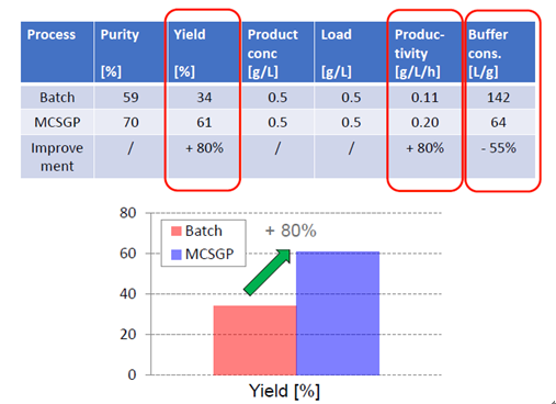 有案例證明,MCSGP可將產(chǎn)品純度從傳統(tǒng)工藝的59%提升至70%,將收率從傳統(tǒng)工藝的34%提升至61%,從而使產(chǎn)量(g /L /h)整體提升80%,并同時使Buffer的消耗量降低55%。MCSGP工藝,無疑可顯著地節(jié)約成本投入,并可產(chǎn)生更多的生產(chǎn)效益。