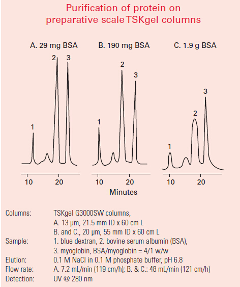 1. TSKgel SW-型填料由含二醇基官能團(tuán)的剛性球形硅膠顆粒組成。