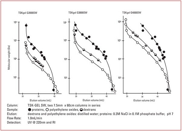 SW型柱以高多孔性硅膠顆粒為基礎,其表面因受二醇功能基配體的衍生作用保護而不與蛋白質相互作用。TSKgel SW型柱憑借其大孔隙容積而勝過其它硅膠基質或聚合物高性能尺寸排阻柱。