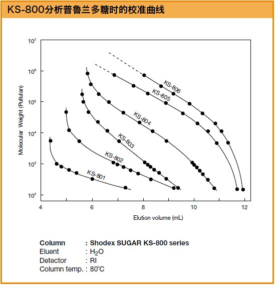SUGAR KS-803色譜柱是以聚苯乙烯-二乙烯基苯為基質的,分離原理結合了配體交換色譜法和尺寸排阻法,主要用于糖類的分離。用水做流動相即可分離中性糖。