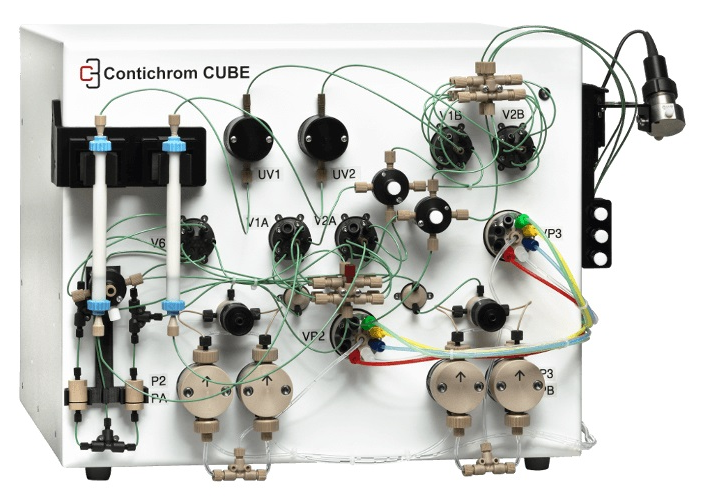 Contichrom層析系統,已由2004年的6-8柱位設計、2006年的3柱位設計,發展為最優化的2柱位設計,可運行多種層析模式,如標準批處理過程、MCSGP(多柱逆流溶劑梯度純化)、N-Rich等,實現了層析新技術與層析系統軟硬件設計的完美結合,使得設備成本更低,構造更為簡化,并可使層析填料、緩沖液等成本投入大為節省,同時也使得純化周期大為縮短。